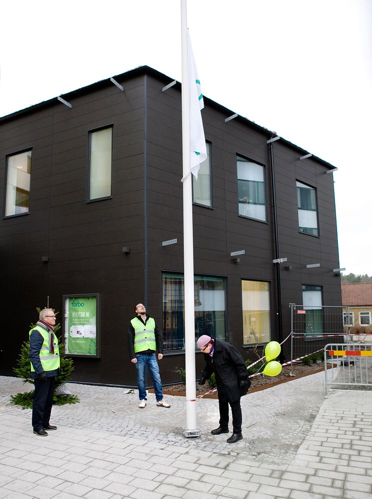 Förbos VD Peter Granstedt och kommunstyrelsens ordförande Annette Eiserman-Wikström hissar flaggan vid invigningsceremonin.