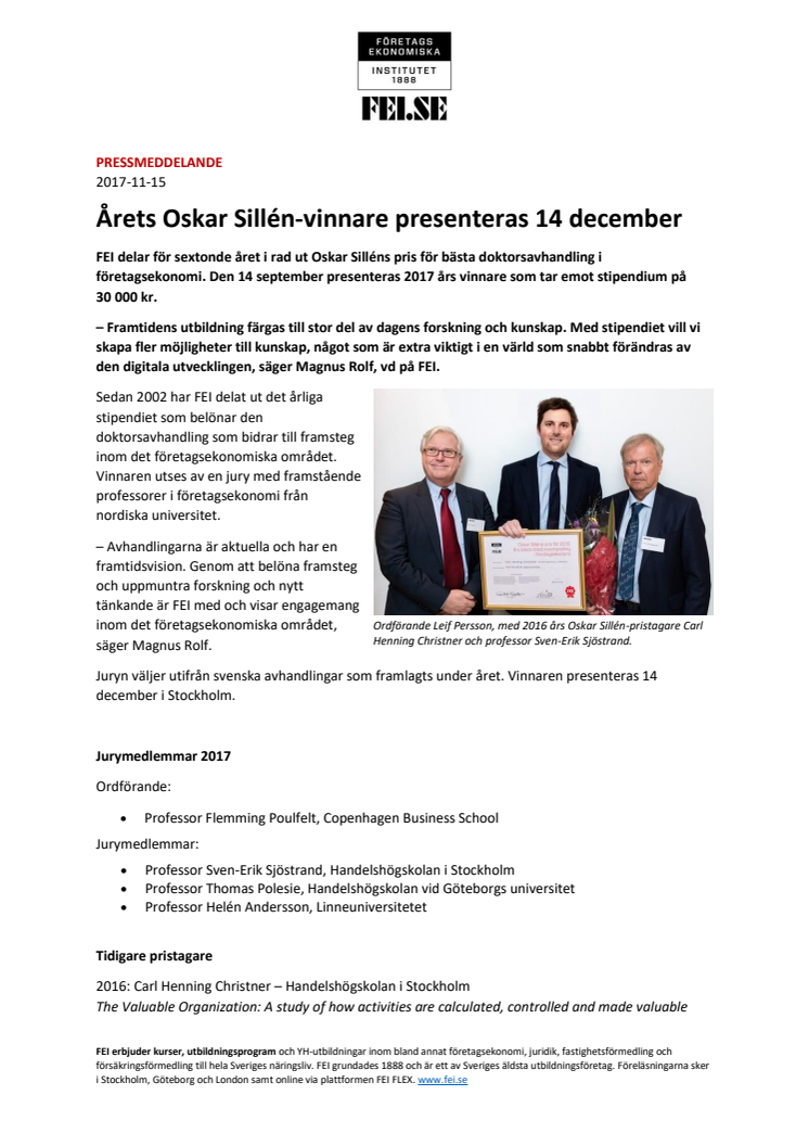 FEI delar för sextonde året i rad ut Oskar Silléns pris för bästa doktorsavhandling i företagsekonomi. Den 14 september presenteras 2017 års vinnare som tar emot stipendium på 30 000 kr.