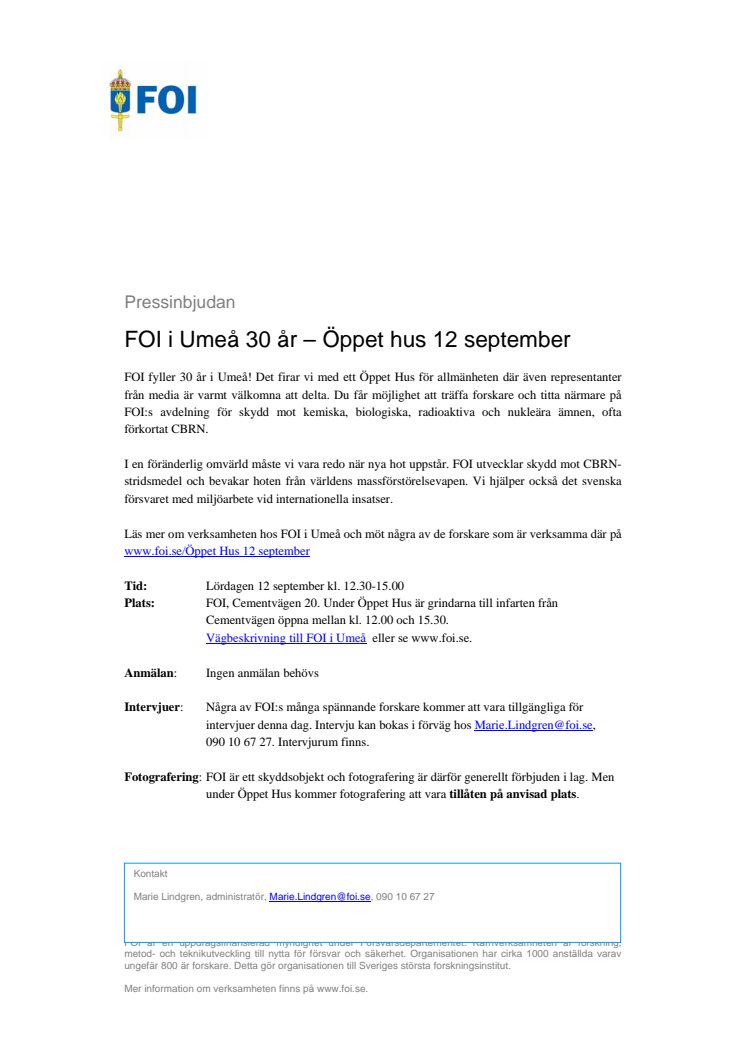FOI fyller 30 år i Umeå! Det firar vi med ett Öppet Hus för allmänheten där även representanter från media är varmt välkomna att delta. Du får möjlighet att träffa forskare och titta närmare på FOI:s avdelning för skydd mot kemiska, biologiska, radioaktiva och nukleära ämnen, ofta förkortat CBRN.