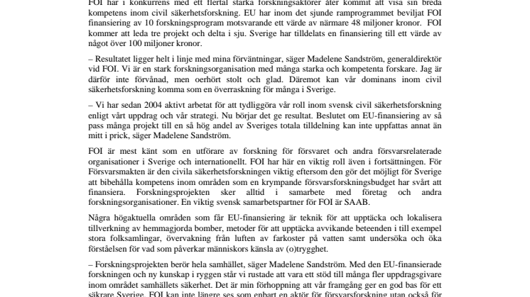 – Forskningsprojekten berör hela samhället, säger Madelene Sandström. Med den EU-finansierade forskningen och ny kunskap i ryggen står vi rustade att vara ett stöd till många fler uppdragsgivare inom området samhällets säkerhet. Det är min förhoppning att vår framgång ger en god bas för ett säkrare Sverige. FOI kan inte längre ses som enbart en aktör för försvarsforskning utan också för forskning inom hela det breda säkerhetsområdet. En klok planering där Sveriges samlade forskningskompetens tas tillvara kommer att leda till att Sverige ligger steget före när det gäller säkerhet och försvar, innovation och framtida svensk teknikexport.