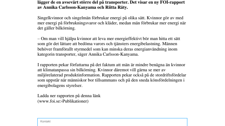 Mäns totala energiförbrukning är 20 procent högre än kvinnors. Dessutom lägger de en avsevärt större del på transporter. Det visar en ny FOI-rapport av Annika Carlsson-Kanyama och Riitta Räty.