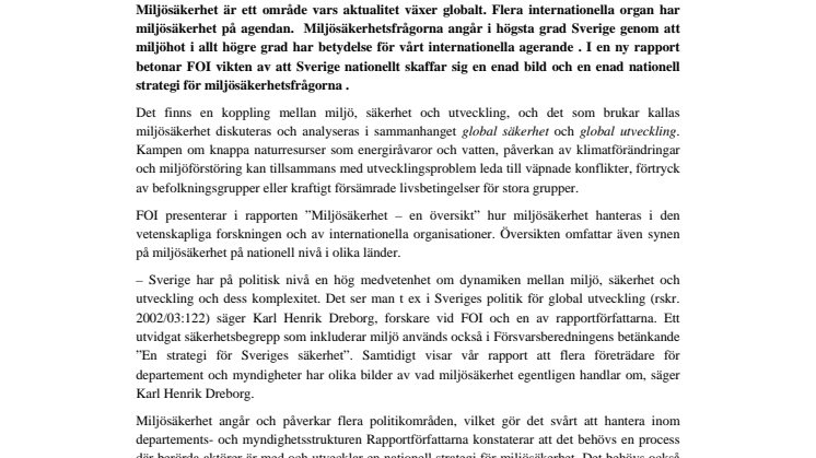 Miljösäkerhet är ett område vars aktualitet växer globalt. Flera internationella organ har miljösäkerhet på agendan. Miljösäkerhetsfrågorna angår i högsta grad Sverige genom att miljöhot i allt högre grad har betydelse för vårt internationella agerande. I en ny rapport betonar FOI vikten av att Sverige nationellt skaffar sig en enad bild och en enad nationell strategi för miljösäkerhetsfrågorna.