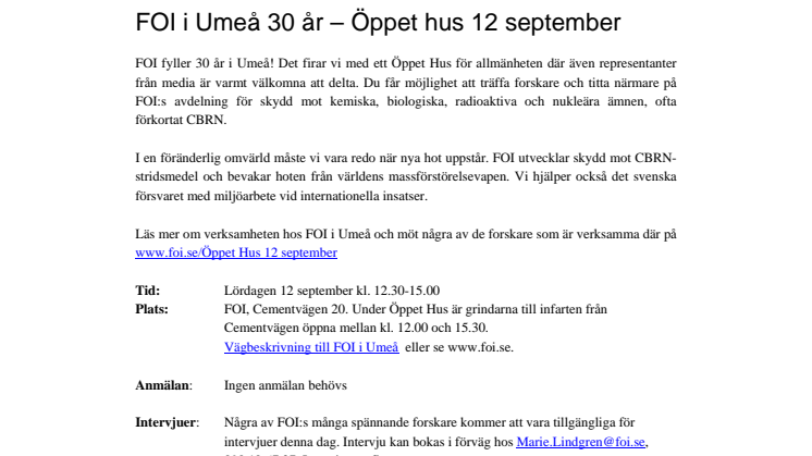 FOI fyller 30 år i Umeå! Det firar vi med ett Öppet Hus för allmänheten där även representanter från media är varmt välkomna att delta. Du får möjlighet att träffa forskare och titta närmare på FOI:s avdelning för skydd mot kemiska, biologiska, radioaktiva och nukleära ämnen, ofta förkortat CBRN.
