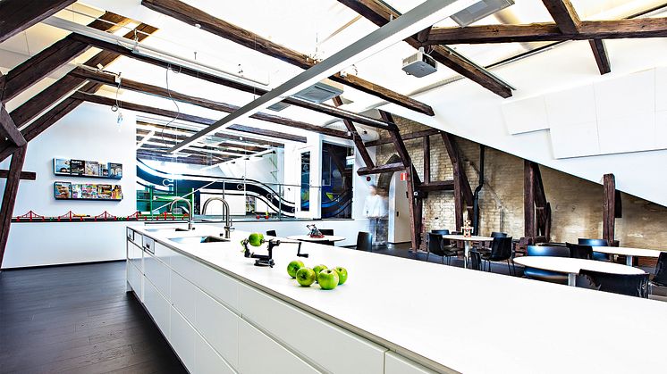 – Det är råvinden på Malmö Central som förvandlats till BRIO:s nya huvudkontor. Fastighetsägaren Jernhusen hade förberett anpassningen genom att bland annat återställa trapphus, lägga om tak, förstärka bjälklag och förbereda installationer.– Vi utgick från vindens speciella karaktär med tegelvalv och mäktiga träkonstruktioner och arbetade med specialritad inredning. Alla vinklar och vrår utnyttjades för att få plats. Det har lett till både oväntade och spännande lösningar, tycker jag. Det fanns så klart också en hel del installationer att ta hänsyn till. En del är dolda men andra har integrerats fullt synligt i designen.
