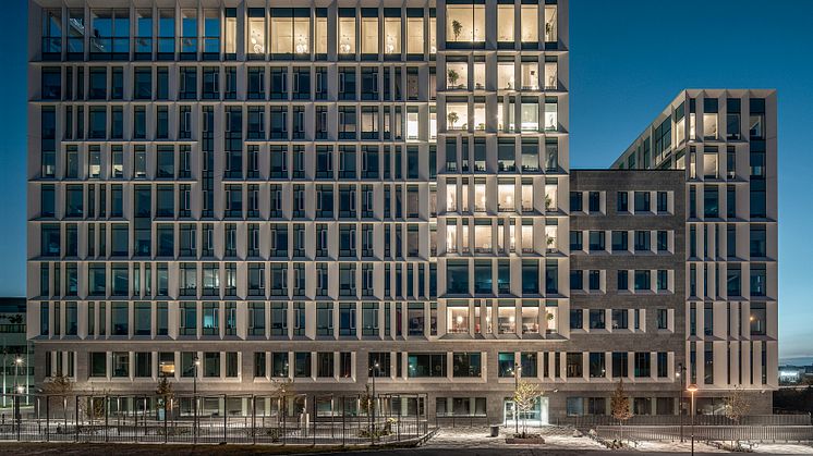 – Utblickarna är viktiga för upplevelsen. Redan vid entrén anar du inner- och ljusgårdarna längre in i byggnaden. Ett av våra mål har varit att uppmuntra folk att ta trappan istället för hissen – därför finns generösa glaspartier på varje våningsplan som hela tiden belönar dig med en ny vy över staden och slätten, och från takterrassen ser du hela vägen till Köpenhamn, säger Andreas.