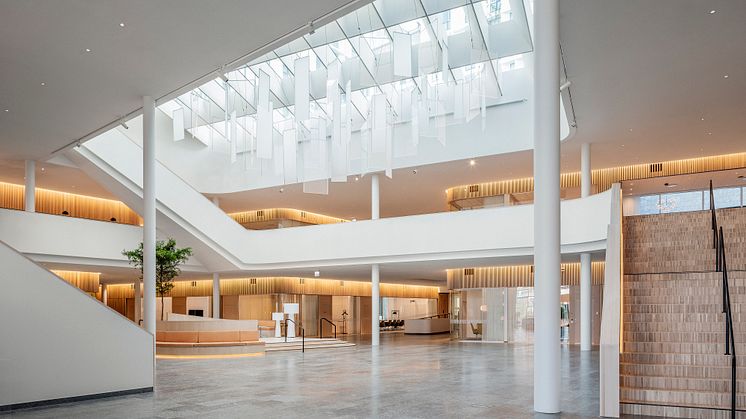 Projekt: Axis Grenden, Lund. FOJAB står för hus, landskap, invändig gestaltning med fast inredning samt träribbor. Landén Krantz står för lös inredning, inredningskoncept och viss fast inredning. Light Bureau står för belysningskonceptet.