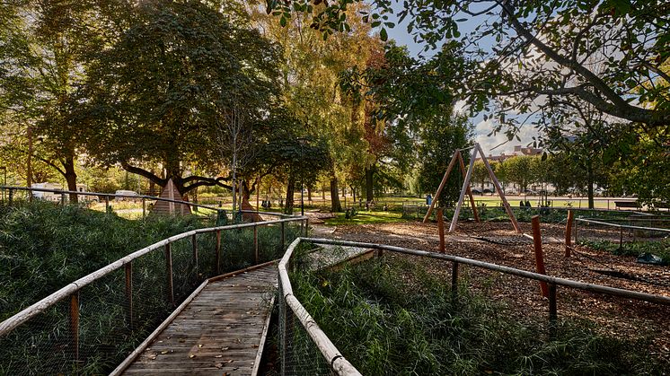 En redan grön del av parken har förstärkts med träd som flyttats från andra ställen i parken, och med ett rikt örtskikt som bidrar med pollinering och biologisk mångfald i närområdet. Träspänger gör att besökarna kan uppleva miljön inifrån och spännande lekutrustning binder ihop denna del av parken med den befintliga lekplatsen.