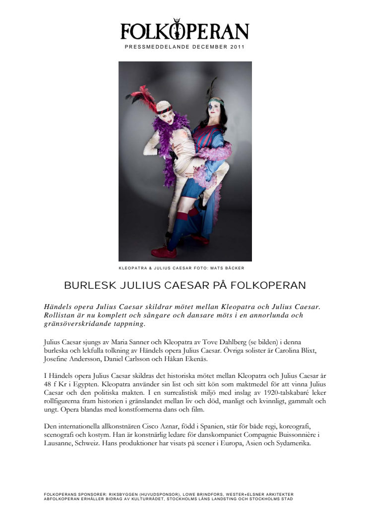 Händels opera Julius Caesar skildrar mötet mellan Kleopatra och Julius Caesar. Rollistan är nu komplett och sångare och dansare möts i en annorlunda och gränsöverskridande tappning.