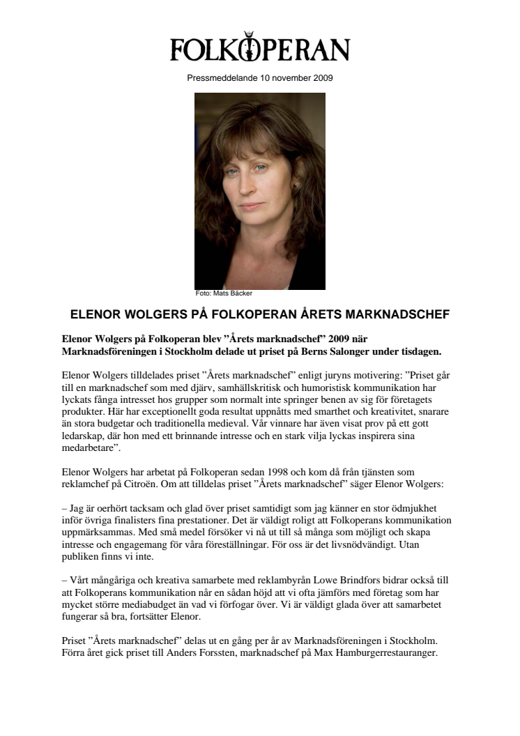 Elenor Wolgers på Folkoperan blev ”Årets marknadschef” 2009 när Marknadsföreningen i Stockholm delade ut priset på Berns Salonger under tisdagen.