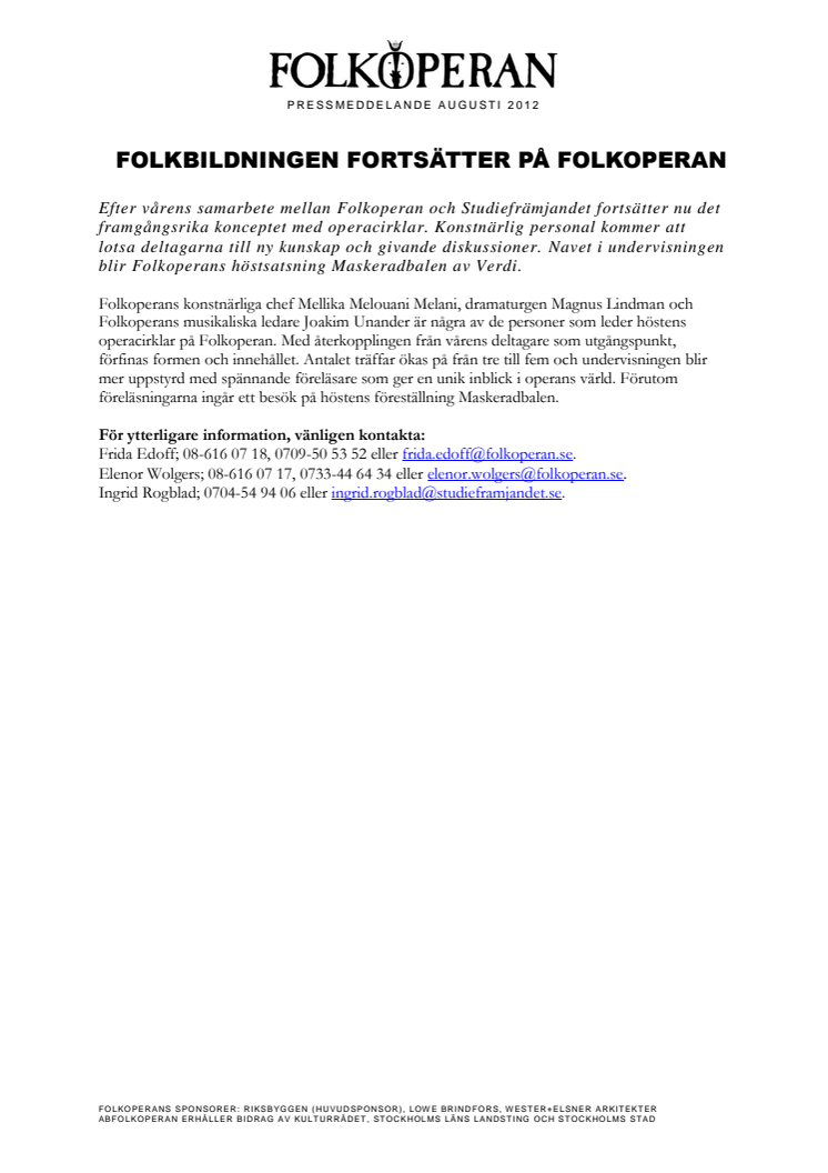 Efter vårens samarbete mellan Folkoperan och Studiefrämjandet fortsätter nu det framgångsrika konceptet med operacirklar. Konstnärlig personal kommer att lotsa deltagarna till ny kunskap och givande diskussioner. Navet i undervisningen blir Folkoperans höstsatsning Maskeradbalen av Verdi.