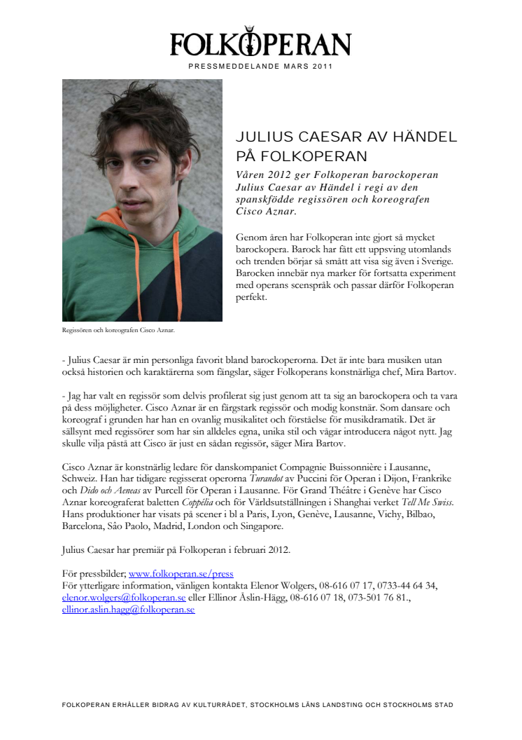 Våren 2012 ger Folkoperan barockoperan Julius Caesar av Händel i regi av den spanskfödde regissören och koreografen Cisco Aznar.