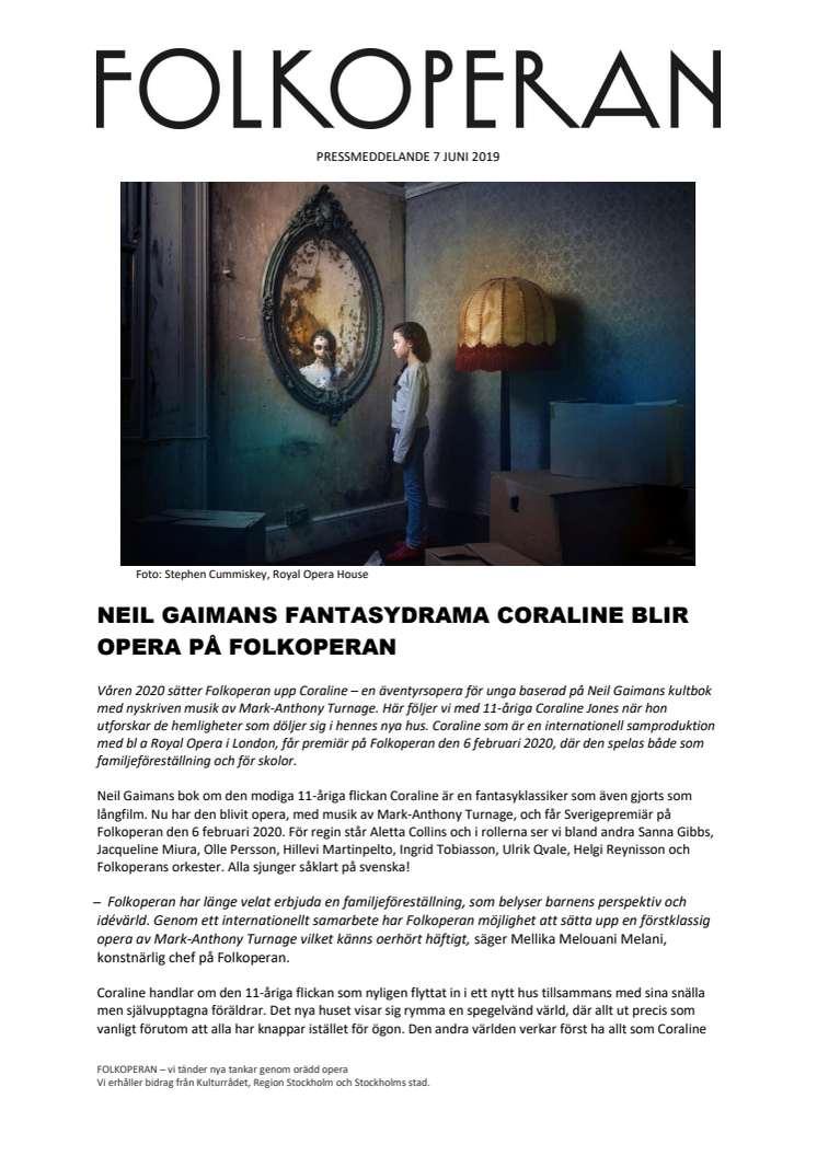 NEIL GAIMANS FANTASYDRAMA CORALINE BLIR OPERA PÅ FOLKOPERAN