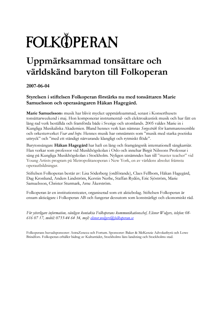 Styrelsen i stiftelsen Folkoperan förstärks nu med tonsättaren Marie Samuelsson och operasångaren Håkan Hagegård.