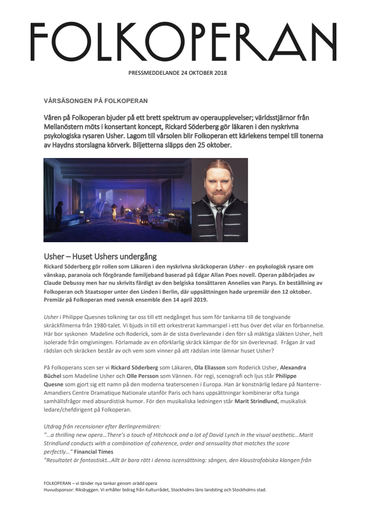 Våren på Folkoperan bjuder på ett brett spektrum av operaupplevelser; världsstjärnor från Mellanöstern möts i konsertant koncept, Rickard Söderberg gör läkare i nyskriven psykologisk rysare och lagom till vårsolen blir Folkoperan ett kärlekens tempel till tonerna av Haydns storslagna körverk. Biljetterna släpps den 25 oktober.