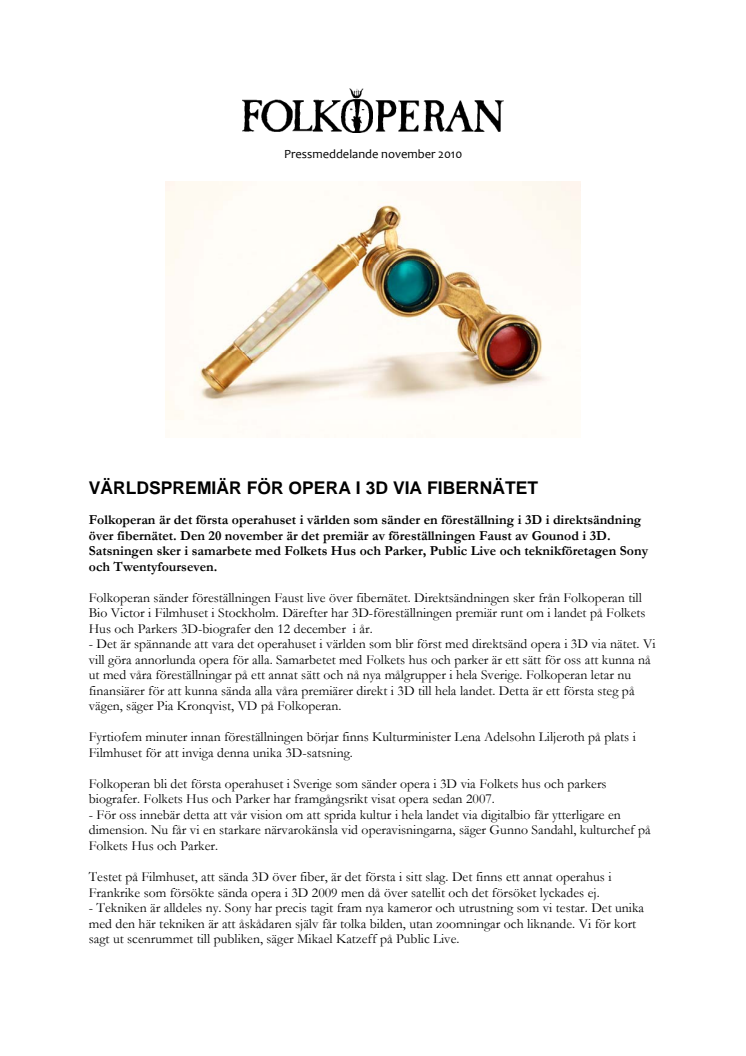Folkoperan är det första operahuset i världen som sänder en föreställning i 3D i direktsändning över fibernätet. Den 20 november är det premiär av föreställningen Faust av Gounod i 3D. Satsningen sker i samarbete med Folkets Hus och Parker, Public Live och teknikföretagen Sony och Twentyfourseven.