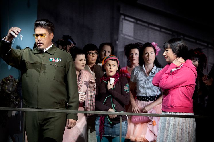 Anders Kjellstrand (Bonzo), Clara Bystrand (Madame Butterfly) och Folkoperans kör