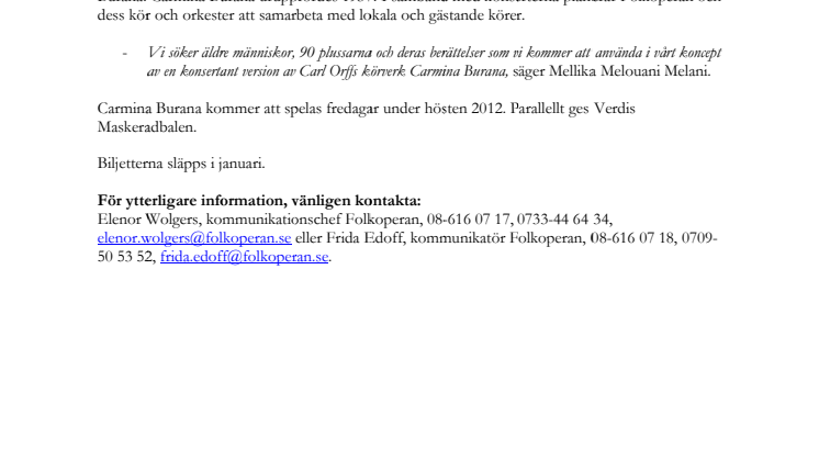 Hösten 2012 ger Folkoperan Carmina Burana av Carl Orff i ett konsertant koncept. Premiär i oktober 2012. Folkoperans nya konstnärliga chef Mellika Melouani Melani regisserar och musikalisk ledare är Joakim Unander.