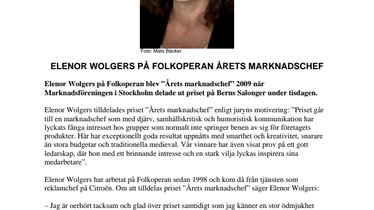 Elenor Wolgers på Folkoperan blev "Årets marknadschef" 2009 när Marknadsföreningen i Stockholm delade ut priset på Berns Salonger under tisdagen.