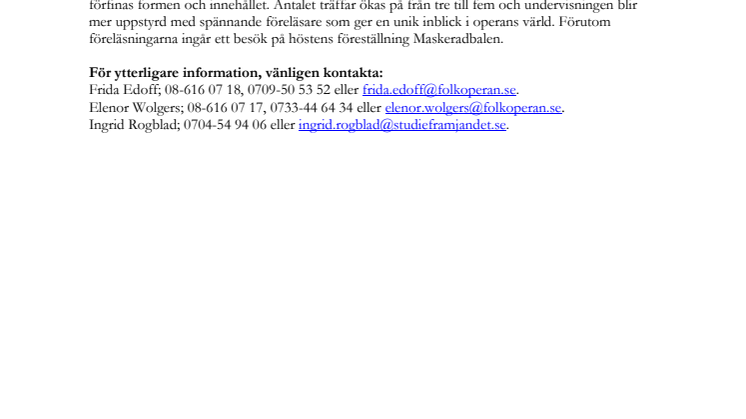Efter vårens samarbete mellan Folkoperan och Studiefrämjandet fortsätter nu det framgångsrika konceptet med operacirklar. Konstnärlig personal kommer att lotsa deltagarna till ny kunskap och givande diskussioner. Navet i undervisningen blir Folkoperans höstsatsning Maskeradbalen av Verdi.