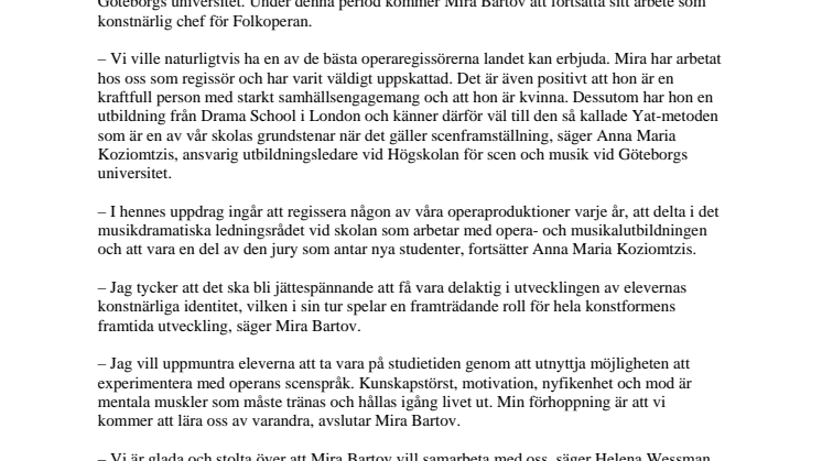 Förordnandet gäller under 2009 och 2010 med start den 1 januari 2009 och innefattar en 20 % tjänst som professor i musikdramatisk gestaltning vid Högskolan för scen och musik vid Göteborgs universitet. Under denna period kommer Mira Bartov att fortsätta sitt arbete som konstnärlig chef för Folkoperan.