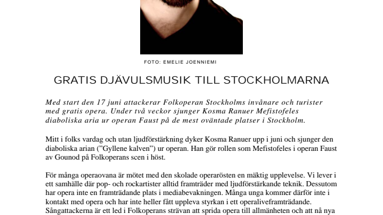 Med start den 17 juni attackerar Folkoperan Stockholms invånare och turister med gratis opera. Under två veckor sjunger Kosma Ranuer Mefistofeles diaboliska aria ur operan Faust på de mest oväntade platser i Stockholm.