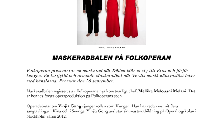 Maskeradbalen har premiär på Folkoperan 26 september 2012 och spelas 4 gånger/veckan hela hösten.