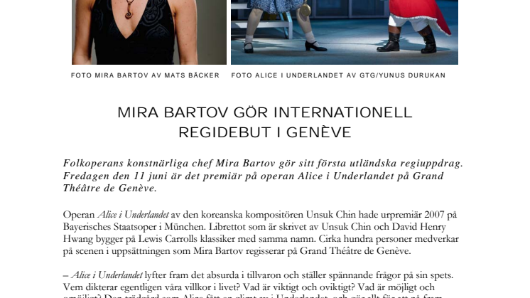 Folkoperans konstnärliga chef Mira Bartov gör sitt första utländska regiuppdrag. Fredagen den 11 juni är det premiär på operan Alice i Underlandet på Grand Théâtre de Genève.