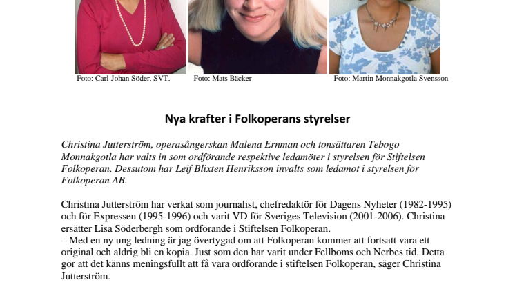 Christina Jutterström, operasångerskan Malena Ernman och tonsättaren Tebogo Monnakgotla har valts in som ordförande respektive ledamöter i styrelsen för Stiftelsen Folkoperan. Dessutom har Leif Blixten Henriksson invalts som ledamot i styrelsen för Folkoperan AB.
