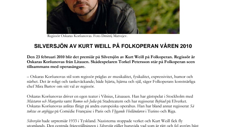 Den 23 februari 2010 blir det premiär på Silversjön av Kurt Weill på Folkoperan. Regissör är Oskaras Koršunovas från Litauen. Skådespelaren Torkel Petersson står på Folkoperan scen tillsammans med operasångare.