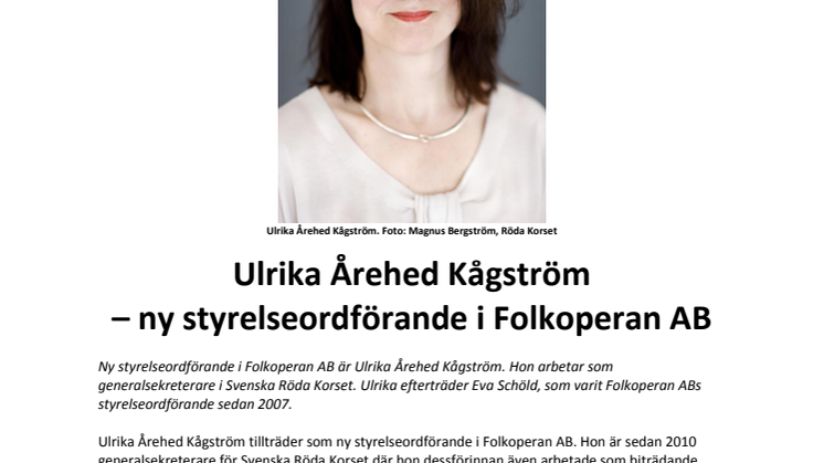 - -Ulrika Årehed Kågström har en bred erfarenhet inom scenkonstområdet och hennes framgångsrika arbete för Röda Korset är imponerande. Med sin raka, orädda och prestigelösa stil blir hon en stor tillgång för Folkoperans styrelsearbete, säger Kerstin Eliasson, ordförande i Stiftelsen Folkoperan.