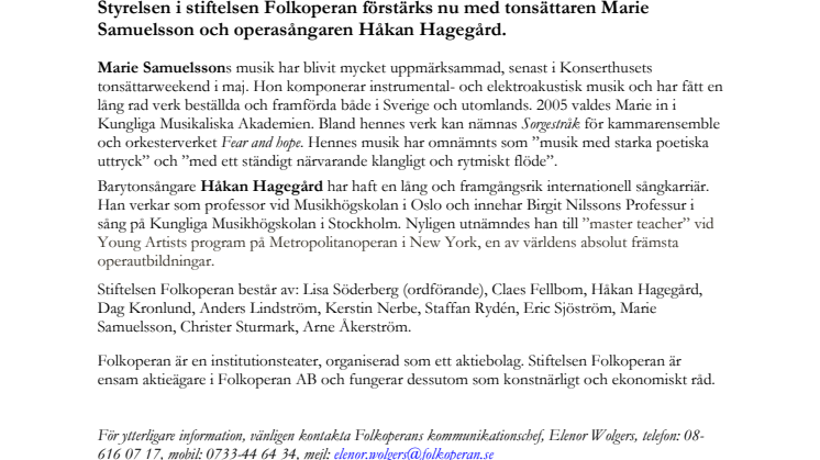 Styrelsen i stiftelsen Folkoperan förstärks nu med tonsättaren Marie Samuelsson och operasångaren Håkan Hagegård.
