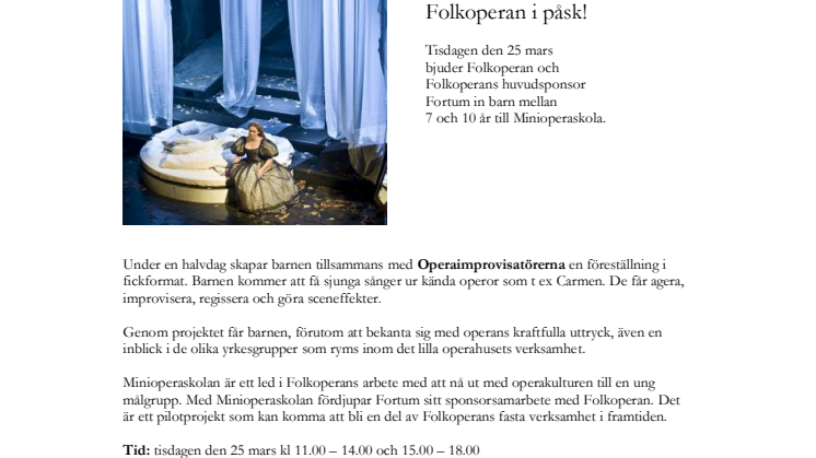 Tisdagen den 25 mars bjuder Folkoperan och Folkoperans huvudsponsor Fortum in barn mellan 7 och 10 år till Minioperaskola.