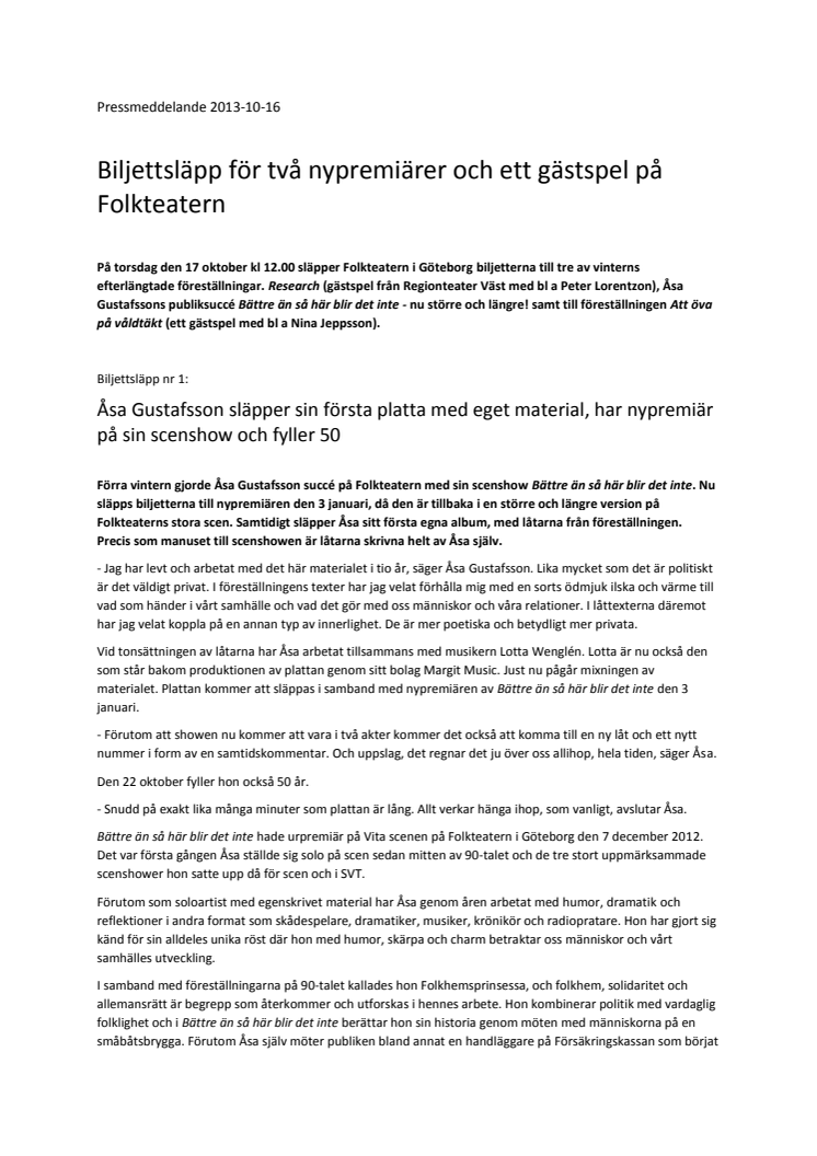 På torsdag den 17 oktober kl 12.00 släpper Folkteatern i Göteborg biljetterna till tre av vinterns efterlängtade föreställningar. Research (ett gästspel från Regionteater Väst med bl a Peter Lorentzon), Åsa Gustafssons publiksuccé Bättre än så här blir det inte - nu större och längre! samt till föreställningen Att öva på våldtäkt (ett gästspel med bl a Nina Jeppsson).