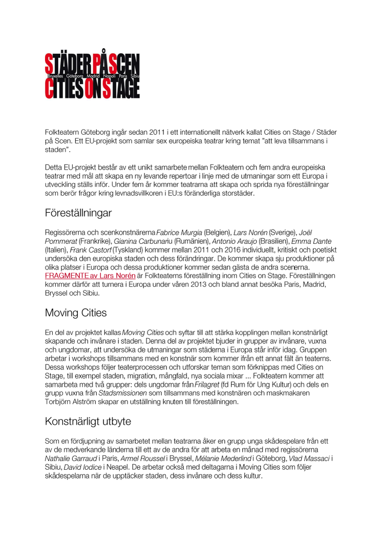 Folkteatern Göteborg ingår sedan 2011 i ett internationellt nätverk kallat Cities on Stage / Städer på Scen. Ett EU-projekt som samlar sex europeiska teatrar kring temat ”att leva tillsammans i staden”.