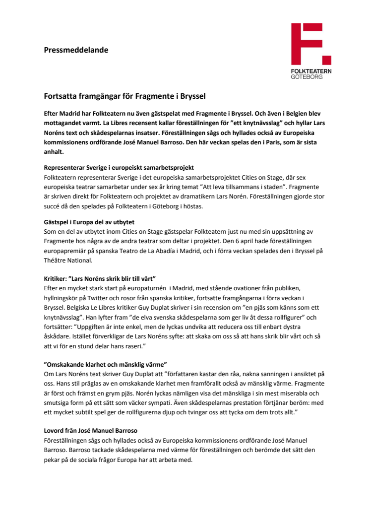 Efter Madrid har Folkteatern nu även gästspelat med Fragmente i Bryssel. Och även där blev mottagandet varmt. La Libres recensent hyllar både Lars Noréns text och skådespelarnas insatser. En annan recensent kallar den "ett knytnävsslag". Föreställningen sågs och hyllades också av Europeiska kommissionens ordförande José Manuel Barroso. Den här veckan spelas den i Paris, som är sista anhalt.