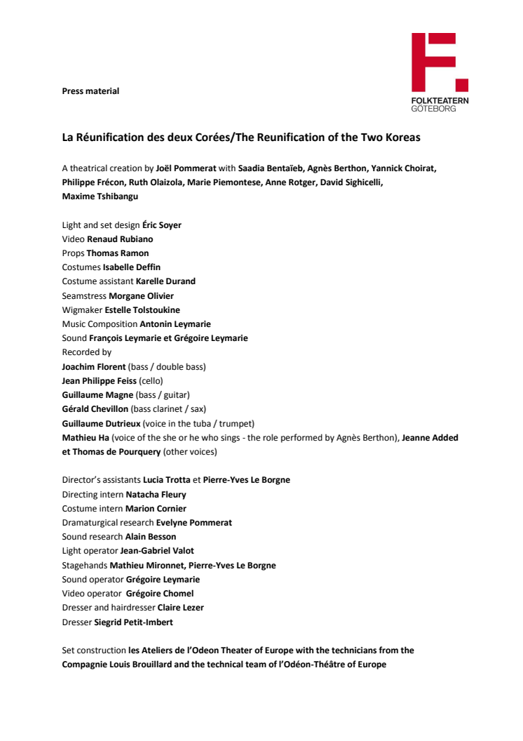 steg i det europeiska samarbetsprojektet Cities on Stage. I nästa vecka får Folkteatern i sin tur europabesök då den franska teatern i projektet gästspelar med sitt bidrag, den hyllade och prisbelönta La Réunification des deux Corées. Bakom uppsättningen står regissören och dramatikern Joël Pommerat.