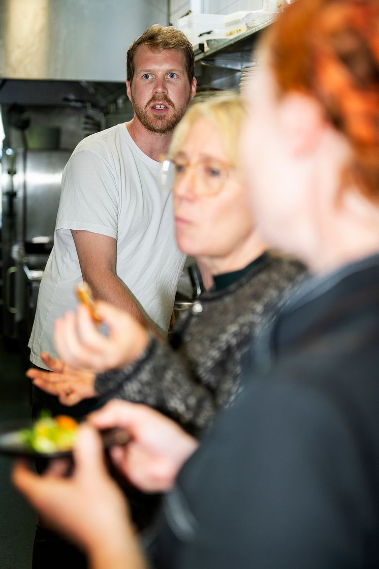 Provlagning av maten till föreställningen "Bobby Fischer bor i Pasadena". Från vänster: Gustav Knutsson, kock, Frida Röhl, regissör och Carina Backman, ljusdesigner.