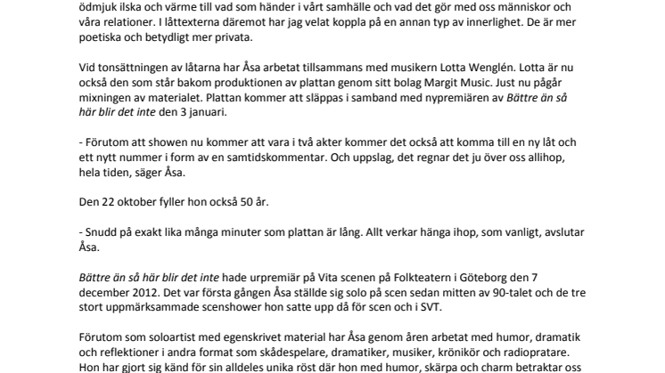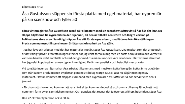 Förra vintern gjorde Åsa Gustafsson succé på Folkteatern med sin scenshow Bättre än så här blir det inte. Nu släpps biljetterna till nypremiären den 3 januari, då den är tillbaka i en större och längre version på Folkteaterns stora scen. Samtidigt släpper Åsa sitt första egna album, med låtarna från föreställningen. Precis som manuset till scenshowen är låtarna skrivna helt av Åsa själv.