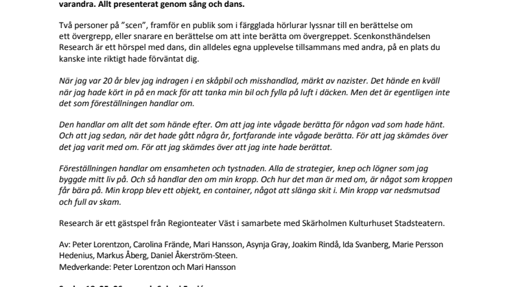 Research är ett gästspel från Regionteater Väst i samarbete med Skärholmen Kulturhuset Stadsteatern.