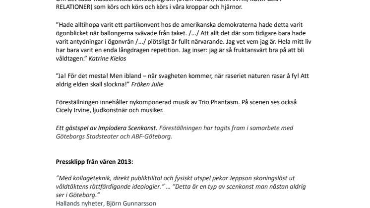 Ett gästspel av Implodera Scenkonst. Föreställningen har tagits fram i samarbete med Göteborgs Stadsteater och ABF-Göteborg.