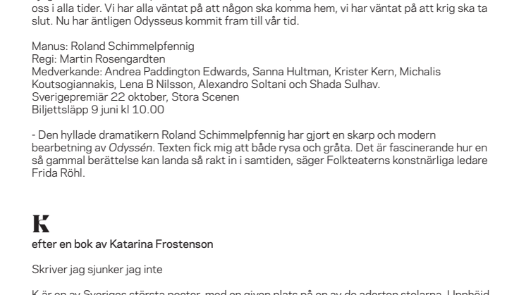 Men innan dess får vi ta del av både ett uruppförande av en av Lars Noréns sista pjäser, Solitaire, och en monolog baserad på Katarina Frostensons bok K. Solitaire är regisserad av Sofia Adrian Jupither och är ett samarbete mellan åtta teatrar, däribland Dramaten, Riksteatern, Folkteatern och teaterfestivalen i Avignon, där uppsättningen också spelas i sommar. I monologen K får vi höra berättelsen om en av Sveriges största poeter, med en given plats på en av de aderton stolarna. Upphöjd och hyllad. Sen kommer explosionen. Hennes man anklagas för grova brott, och mediadrevet rasar. Vad händer med en människa i fritt fall? Kan hon någonsin landa? Kristian Hallberg har dramatiserat pjäsen, Tobias Hagström-Ståhl regisserar och på scenen står Ylva Olaison.