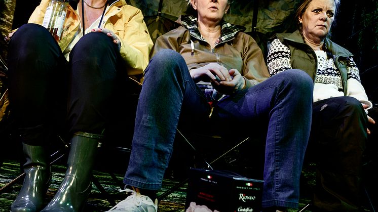 Det är Gertrud Larsson som har skrivit relationskomedin Blåvingar där tre medelålders kvinnor ger sig ut på sin årliga hajk. På ett dråpligt och halsbrytande sätt blandas nostalgiska tillbakablickar på scoutvärderingar (som vännerna en gång möjligtvis delade) med skenande drömmar om gränslös kärlek, kroppsideal och Torremolinos.
