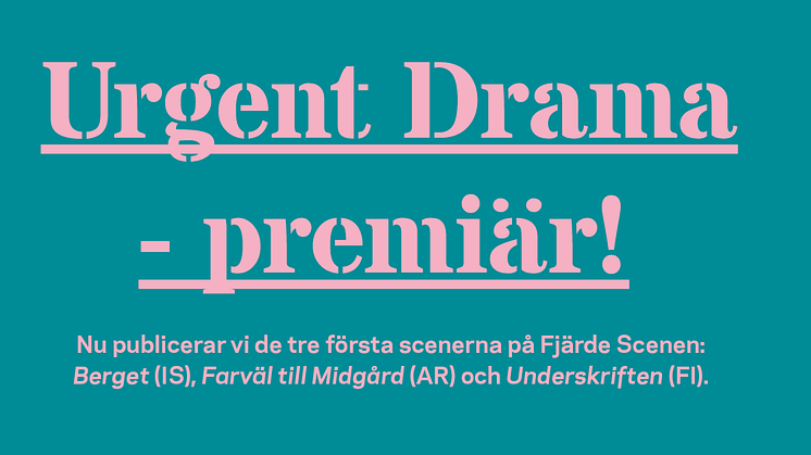 Först ut att presenteras i Urgent Drama på Fjärde Scenen är argentinska dramatikern Rafael Spregelburds Farväl till Midgård, finska Pipsa Lonkas Underskriften, samt isländska Jón Atli Jónassons Berget. Dessa är de första tre, ytterligare ett femtontal kommer att publiceras under de kommande veckorna.