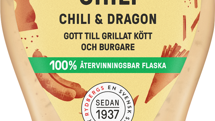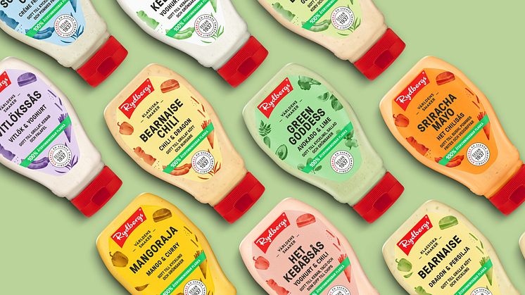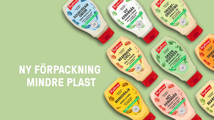 Förpackningsändringarna med etikett och mindre plast i korken gäller alla såser i Rydbergs 250 ml-sortiment; Bearnaise Original, Bearnaise Chili, Mangoraja, Vit Kebabsås, Het Kebabsås, Vitlökssås, Green Goddess, Sourcream Onion, Orientdressing och Sriracha Mayo.