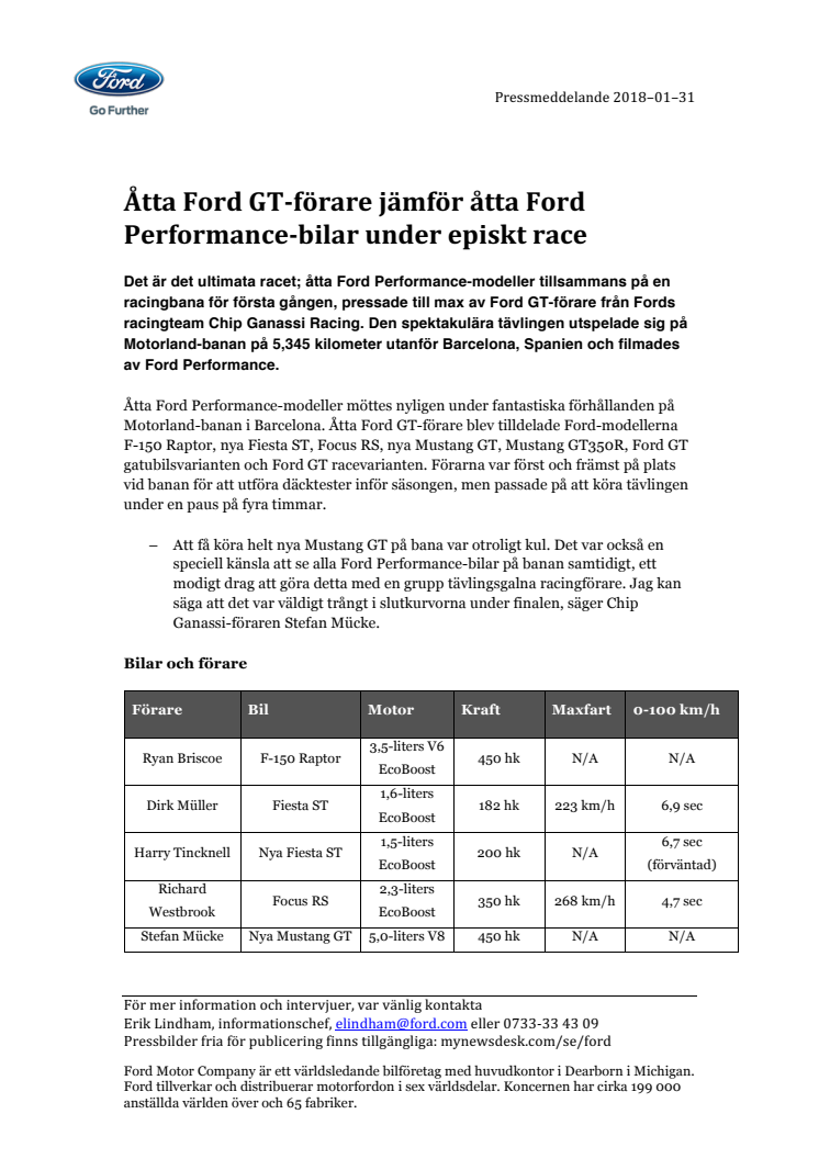 Det är det ultimata racet; åtta Ford Performance-modeller tillsammans på en racingbana för första gången, pressade till max av Ford GT-förare från Fords racingteam Chip Ganassi Racing. Den spektakulära tävlingen utspelade sig på Motorland-banan på 5,345 kilometer utanför Barcelona, Spanien och filmades av Ford Performance.