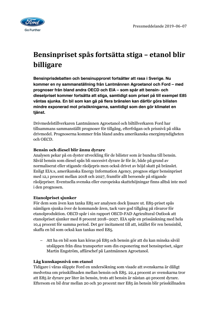 Bensinprisdebatten och bensinupproret fortsätter att rasa i Sverige. Nu kommer en ny sammanställning från Lantmännen Agroetanol och Ford – med prognoser från bland andra OECD och EIA – som spår att bensin- och dieselpriset kommer fortsätta att stiga, samtidigt som priset på till exempel E85 väntas sjunka.