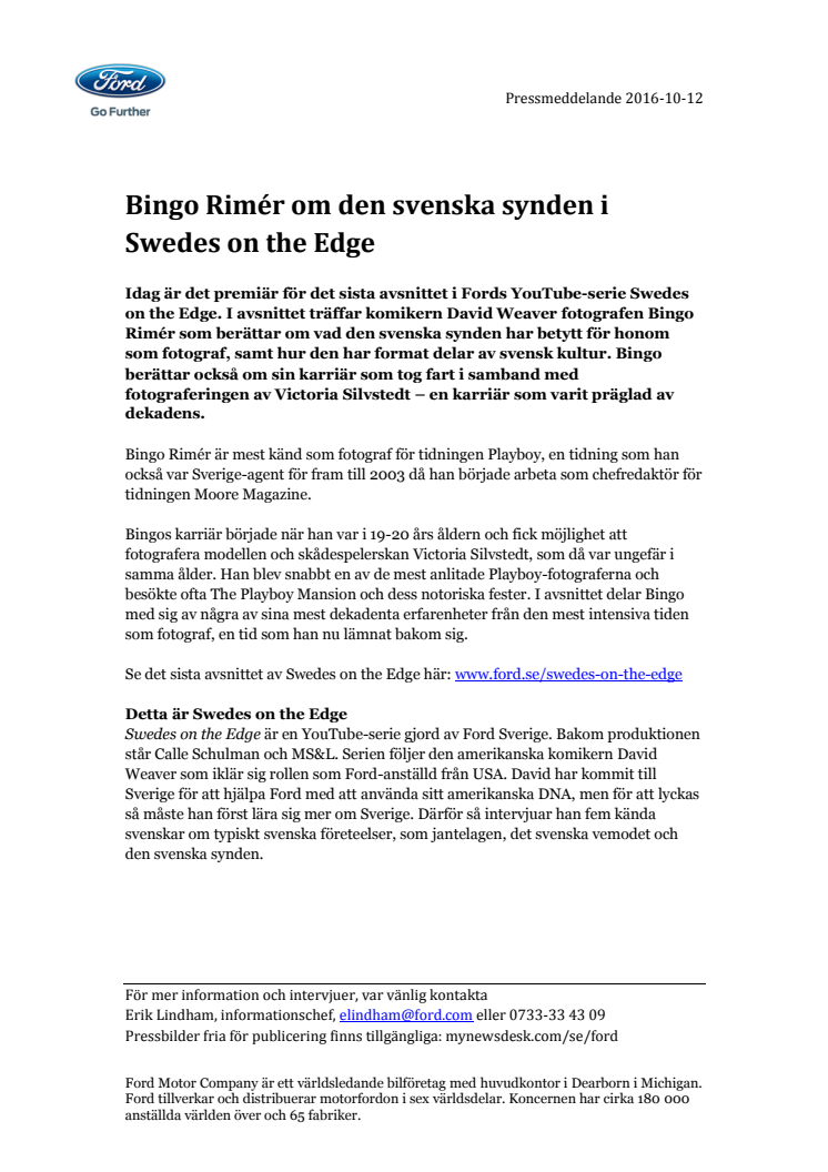 Idag är det premiär för det sista avsnittet i Fords YouTube-serie Swedes on the Edge. I avsnittet träffar komikern David Weaver fotografen Bingo Rimér som berättar om vad den svenska synden har betytt för honom som fotograf, samt hur den har format delar av svensk kultur.