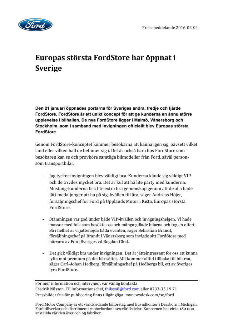 Den 21 januari öppnades portarna för Sveriges andra, tredje och fjärde FordStore. FordStore är ett unikt koncept för att ge kunderna en ännu större upplevelse i bilhallen. De nya FordStore ligger i Malmö, Vänersborg och Stockholm, som i samband med invigningen officiellt blev Europas största FordStore.