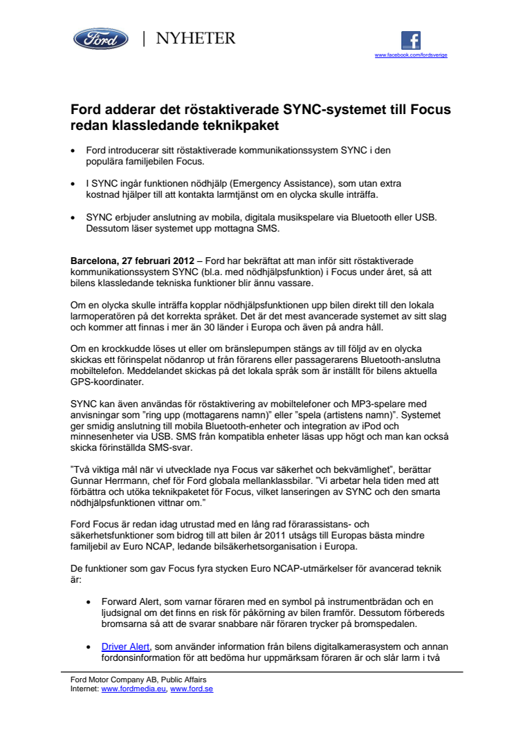 Ford har bekräftat att man inför sitt röstaktiverade kommunikationssystem SYNC (bl.a. med nödhjälpsfunktion) i Focus under året, så att bilens klassledande tekniska funktioner blir ännu vassare.