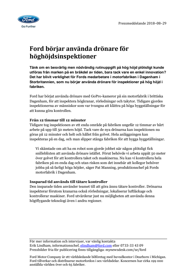 Tänk om en besvärlig men nödvändig rutinuppgift på hög höjd plötsligt kunde utföras från marken på en bråkdel av tiden, bara tack vare en enkel innovation? Det har blivit verklighet för Fords medarbetare i motorfabriken i Dagenham i Storbritannien, som nu börjar använda drönare för inspektioner på hög höjd i fabriken.